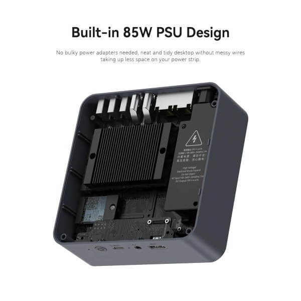 The Intel UHD Graphics capability supports 4K UHD video playback, delivering a breathtaking visual experience. With dual HDMI interfaces, it allows connection to three monitors simultaneously, making multitasking seamless and efficient. The EQi12 Mini PC also features an integrated 85W power supply, reducing cable clutter and simplifying your workspace.