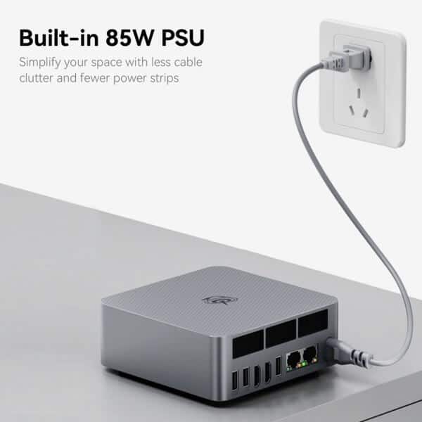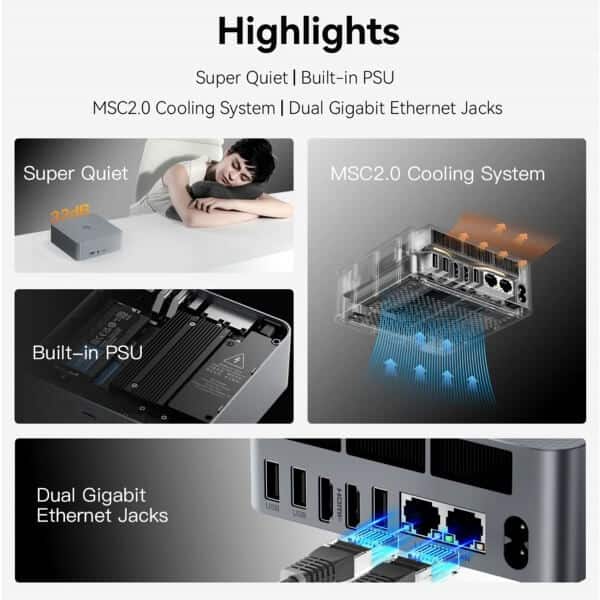 This mini PC excels in video and photo editing, office productivity, and seamless 4K video playback. Its small form factor makes it easy to set up, while advanced connectivity options include Wi-Fi 6 (802.11ax) and Bluetooth 5.2 for faster and more stable connections, along with dual Gigabit Ethernet RJ45 ports for robust network performance. It’s equipped with versatile I/O ports: 2x HDMI, 3x USB 3.2, 1x USB 2.0, 1x Type-C (data), and a 3.5mm audio jack. The innovative MSC 2.0 design ensures efficient heat dissipation, enhancing performance and reliability.