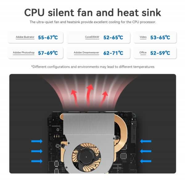 Designed for seamless multitasking and performance, this mini PC comes with 16GB DDR4 memory and a 500GB SATA3 SSD. It also supports expandable storage of up to 2TB via a 2.5-inch NVMe/SATA3 SSD (2280, not included), ensuring smooth operation without lag. The Beelink Mini Desktop computer integrates a large, silent CPU fan, a copper heat sink, and an SSD cooling shield, improving heat dissipation by 40% and enhancing the overall responsiveness of the device.
